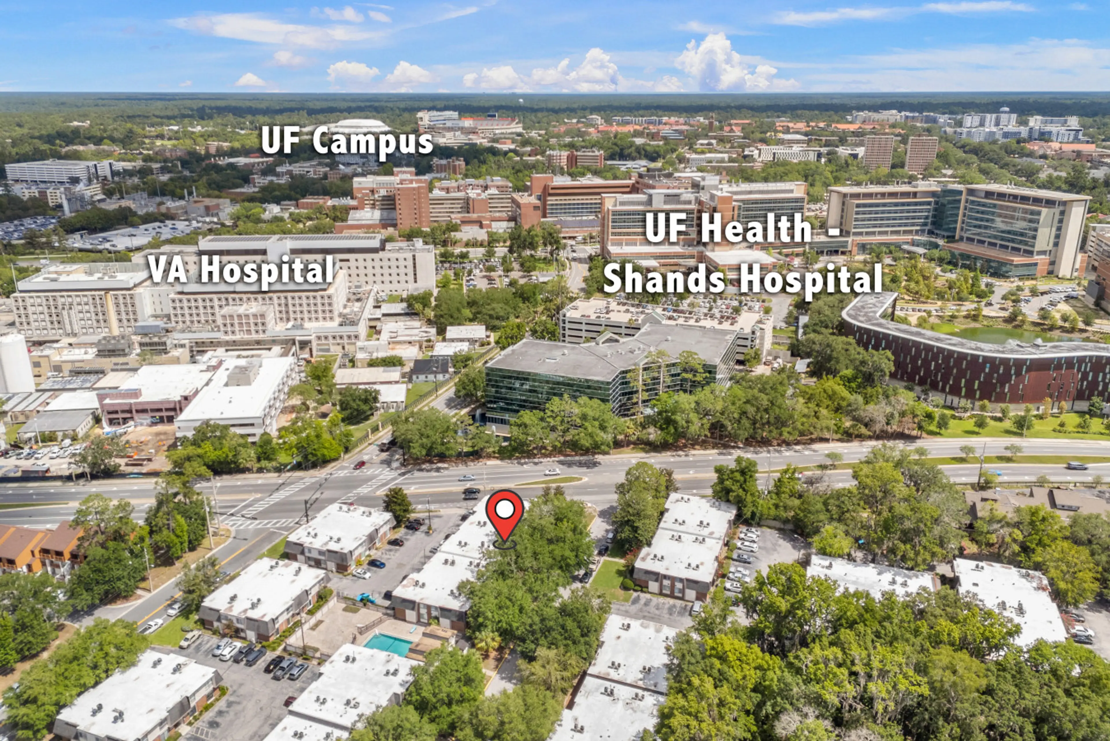 Location, location, location! This ground floor 1 bedroom/ 1 bath unit is walking distance, to Shands/ UF Health, The VA Hospital, the Vet School, and UF Campus. Comfortable, Clean and Convenient with access to common Pool area. ***The bedroom has a queen size bed. In addition we can provide a qu...